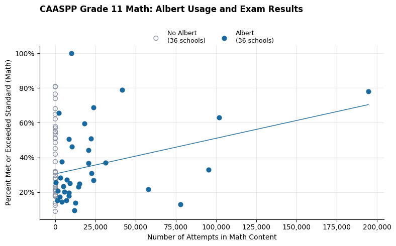 Summary This large-scale study covered 72 California high schools. We matched 36 schools that used Albert with 36 similar schools that didn't, focusing on year-over-year growth and the impact of high-fidelity usage