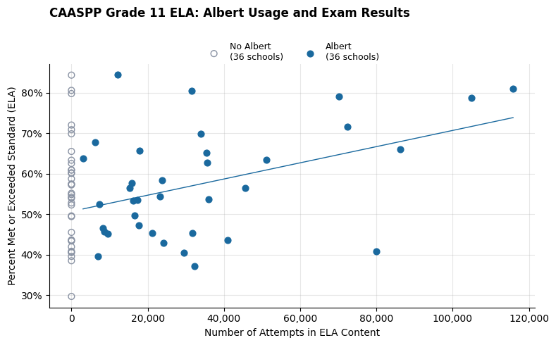 We looked at Grade 11 English Language Arts (ELA) scores in 72 California high schools. Using a rigorous matching process, we compared 36 Albert users against 36 non-users to see how the platform affected literacy outcomes.