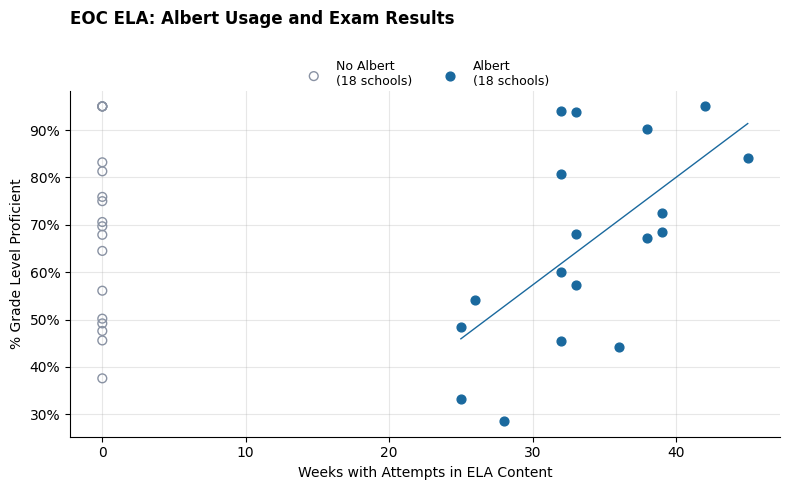 We studied English II EOC scores across 36 North Carolina high schools. Half the schools used Albert for English Language Arts (ELA) practice, and half did not. We matched them on demographics, school size, and academic performance to see how consistent practice impacts student success.
