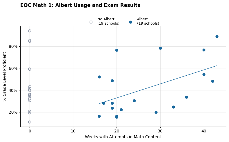 This report looks at how Albert helped students in 38 North Carolina high schools prepare for the Math 1 EOC. We matched 19 Albert-using schools with 19 non-users based on enrollment, economic factors, and prior academic performance to ensure a fair comparison.