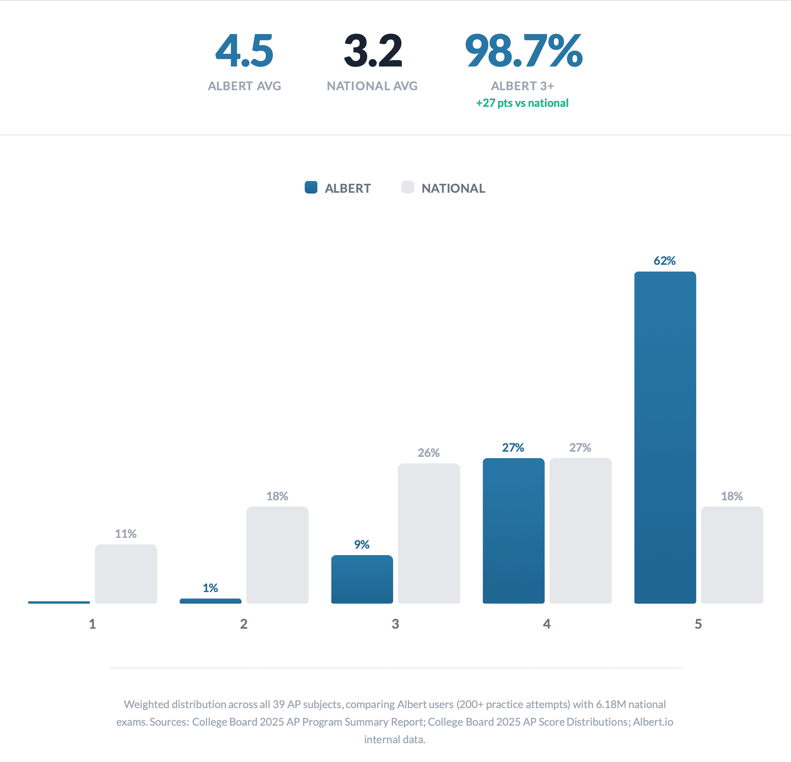 Albert's research shows that students who answer 200+ questions in one of Albert's AP question banks dramatically outperform the national average.